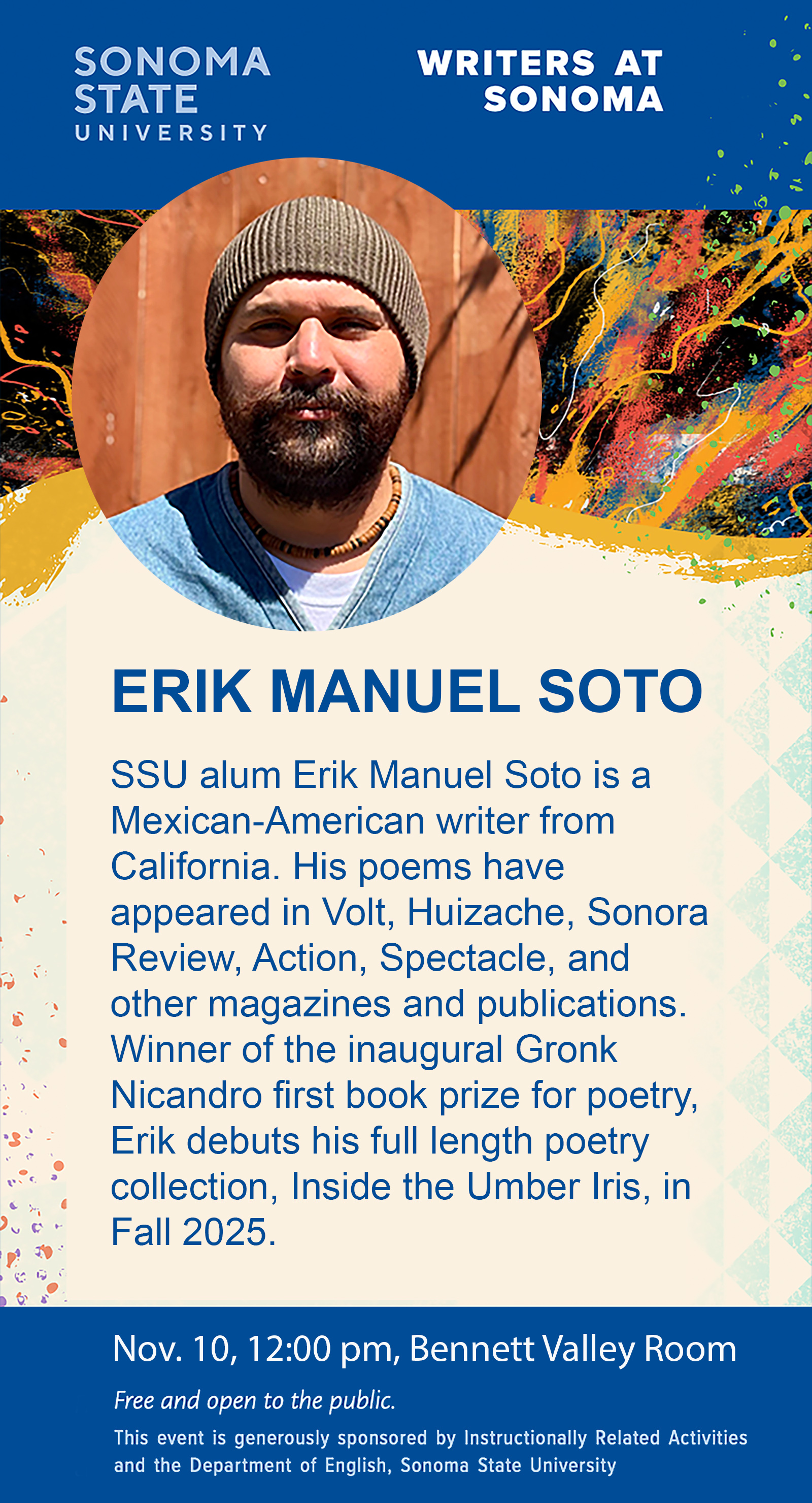 Award-winning poet and English alumnus will speak Monday, November 10th, 12:00 PM in the Bennett Valley Room.